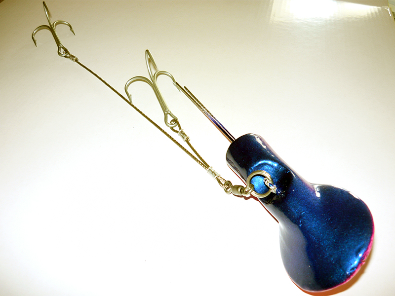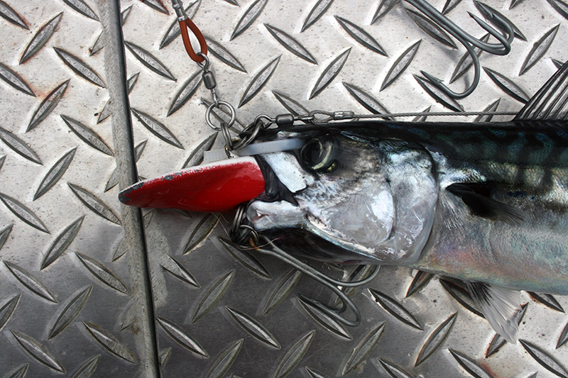 Die Edelstahlschrauben, die am hinteren Köderbereich eingearbeitet sind, ragen in den Köderfisch und geben ihm einen gewissen Halt und Führung. Das Edelstahlvorfach befestigt man an der unteren Öse. Dieses wird gestreckt und die Drillingshaken mit je einem Hakenschenkel in den Köderfisch eingestochen. Nun sitzt ein Haken hinter dem Kopfbereich und einer im Bereich des Afters oder noch weiter in Richtung Schwanzspitze.