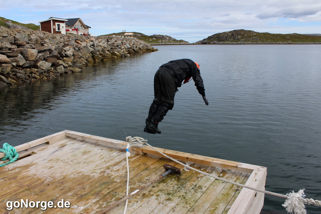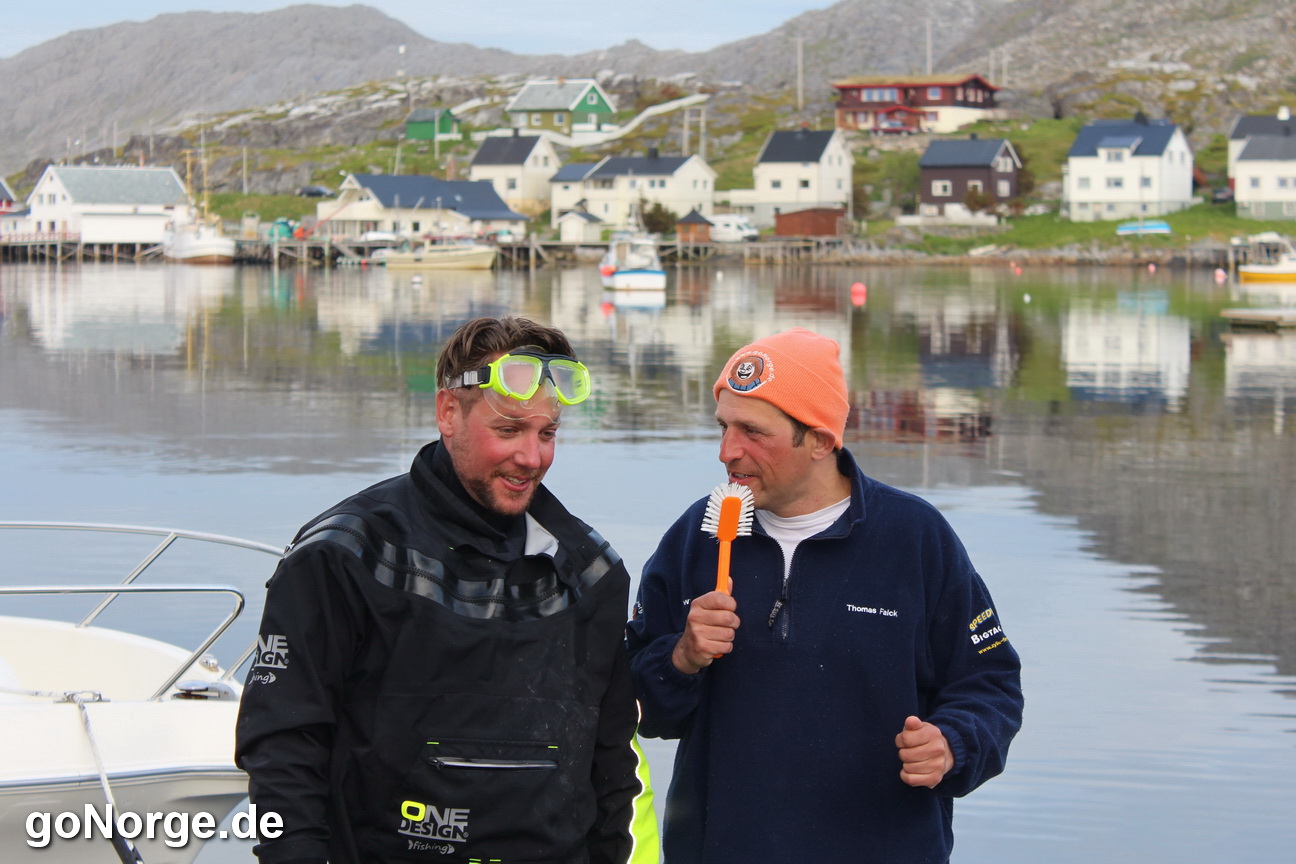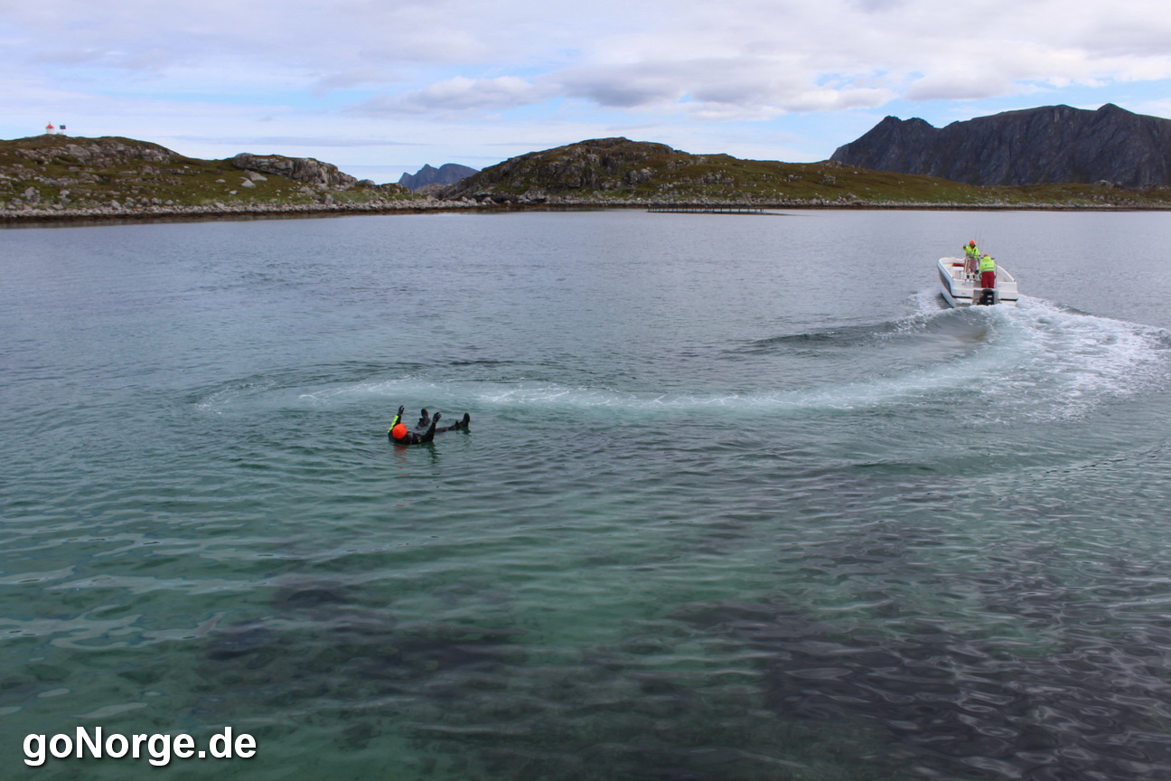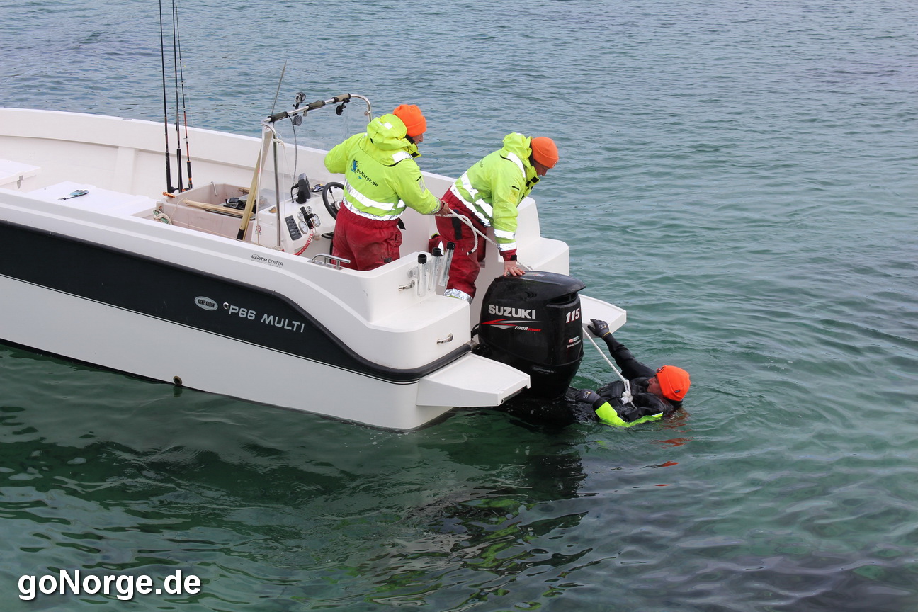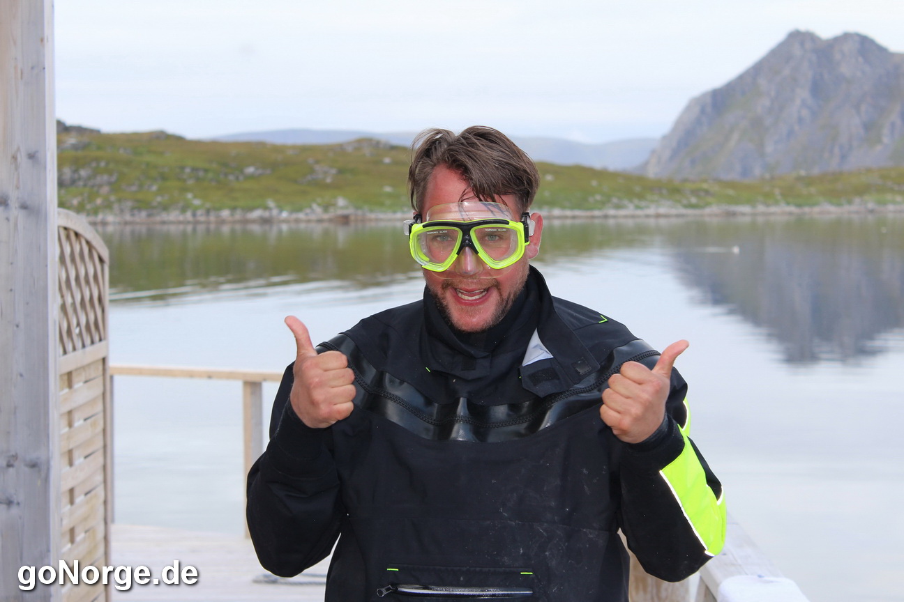 Eines Abends gab es einen Angriff, wie man ihn von Zuhause nicht kennt - dicke Stechmücken schwirrten umher und stürzten sich sofort auf jedes Stück nackte Haut und stachen schmerzvoll zu. Bei Abwehrbewegungen wischte sich ein Gast seine neue 600 Euro Brille vom Kopf. Die schwarze Sehhilfe versank in ca. 6m Wassertiefe und ward nicht mehr gesehen. Das goNorge Team startete eine komplexe Bergungsmission: Ein bunter Pilker wurde am Grund abgelegt. Dann kam die Go Pro Unterwasserkamera zum Einsatz. Nach Auswertung des Videos war die Brille lokalisiert,- sie lag neben einem dicken Felsen in einer Vertiefung unweit des Pilkers. Mit einer beschwerten Leine stellte Robert eine Verbindung vom Schwimmsteg zum Grund her. An diesem Seil tauchte Bastin dann mit unserem neuen Trockenanzug von der Firma „One Design“ im 6 Grad kalten Wasser hinab und brachte die Sehhilfe unversehrt an die Oberfläche. Der Gemütszustand des Besitzers hellte sich umgehend auf. Spaß hatten Alle bei der Aktion!