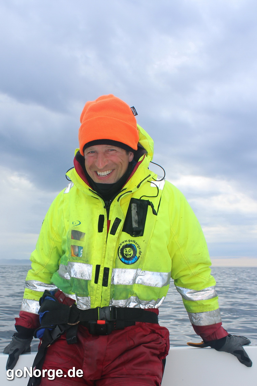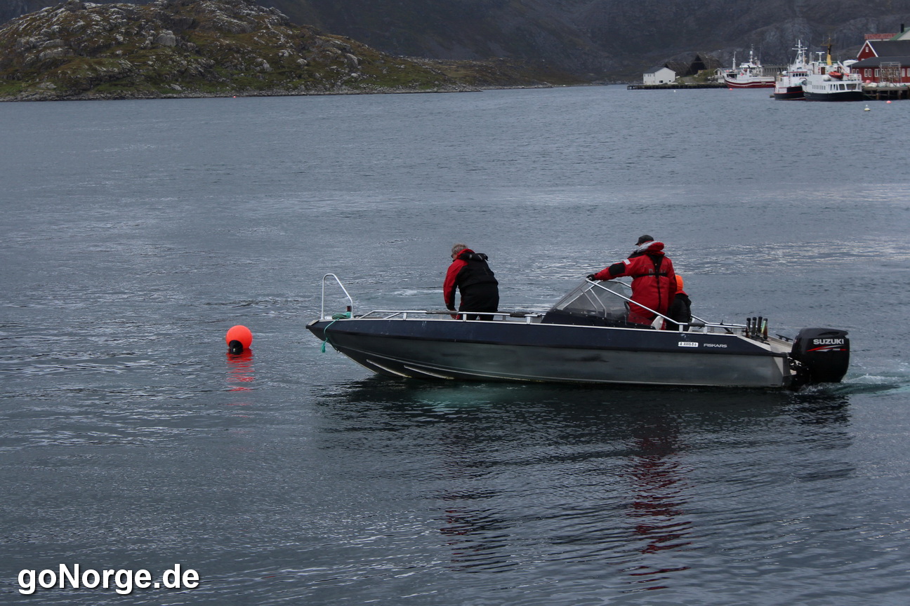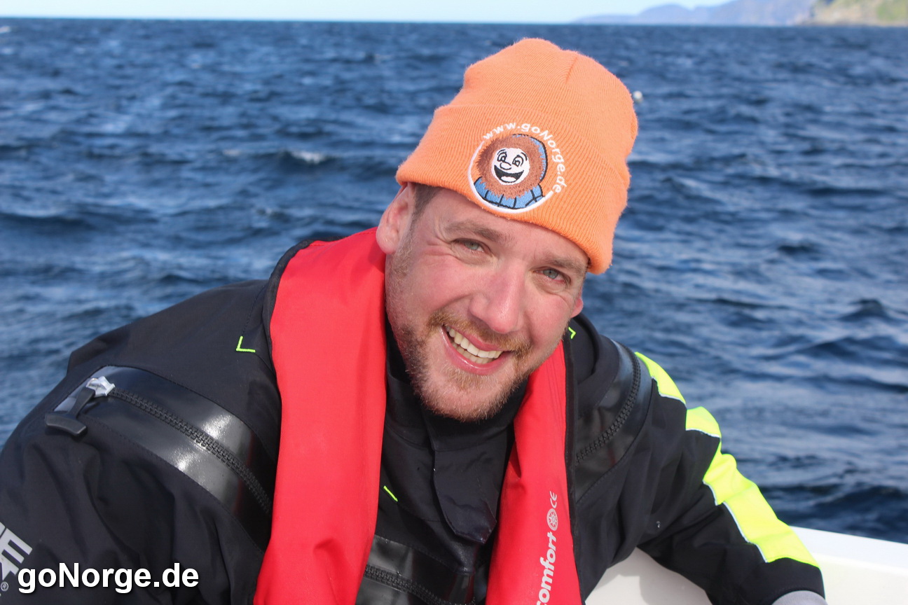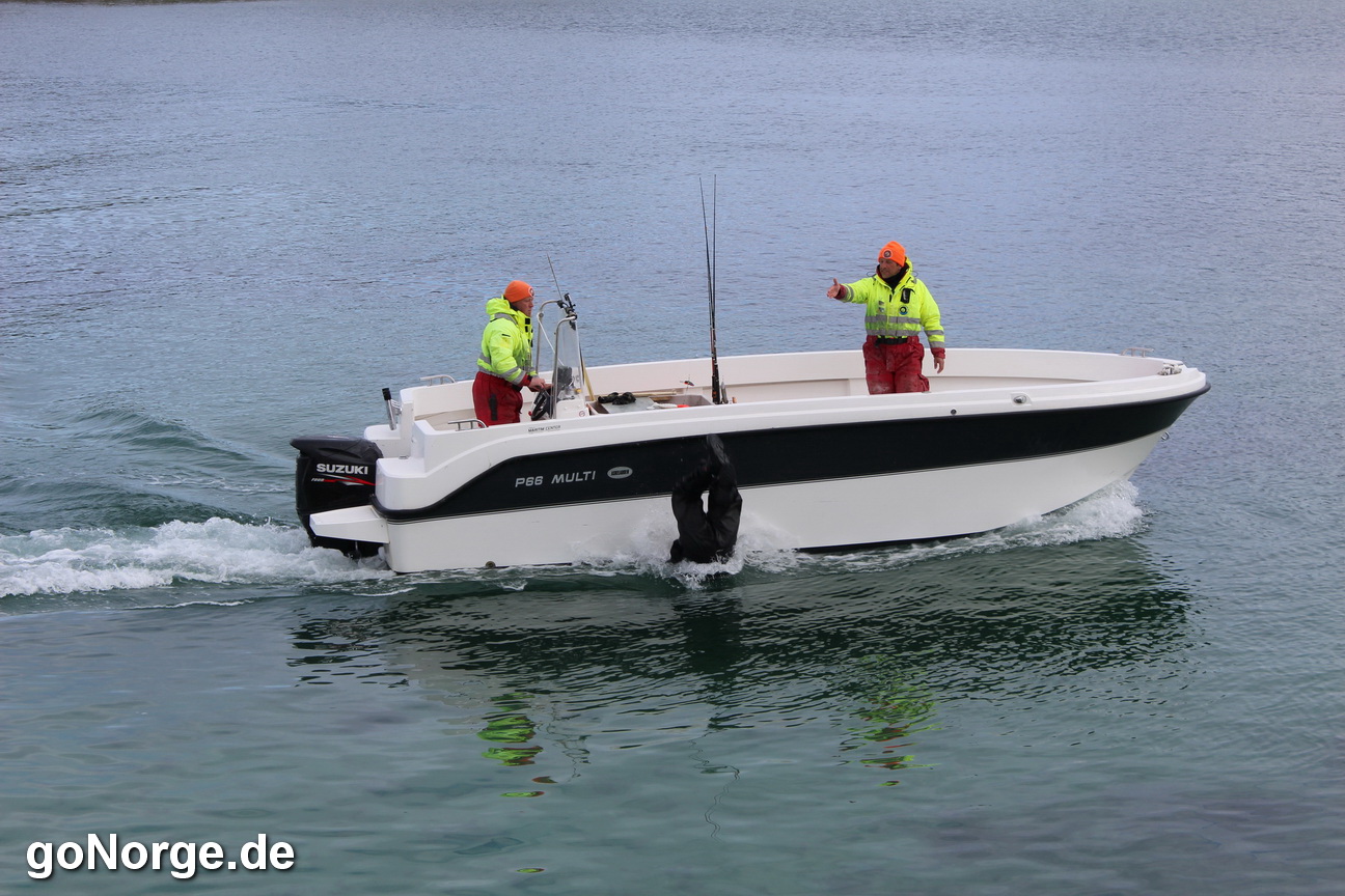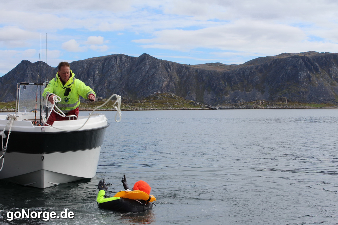 Eines Abends gab es einen Angriff, wie man ihn von Zuhause nicht kennt - dicke Stechmücken schwirrten umher und stürzten sich sofort auf jedes Stück nackte Haut und stachen schmerzvoll zu. Bei Abwehrbewegungen wischte sich ein Gast seine neue 600 Euro Brille vom Kopf. Die schwarze Sehhilfe versank in ca. 6m Wassertiefe und ward nicht mehr gesehen. Das goNorge Team startete eine komplexe Bergungsmission: Ein bunter Pilker wurde am Grund abgelegt. Dann kam die Go Pro Unterwasserkamera zum Einsatz. Nach Auswertung des Videos war die Brille lokalisiert,- sie lag neben einem dicken Felsen in einer Vertiefung unweit des Pilkers. Mit einer beschwerten Leine stellte Robert eine Verbindung vom Schwimmsteg zum Grund her. An diesem Seil tauchte Bastin dann mit unserem neuen Trockenanzug von der Firma „One Design“ im 6 Grad kalten Wasser hinab und brachte die Sehhilfe unversehrt an die Oberfläche. Der Gemütszustand des Besitzers hellte sich umgehend auf. Spaß hatten Alle bei der Aktion!