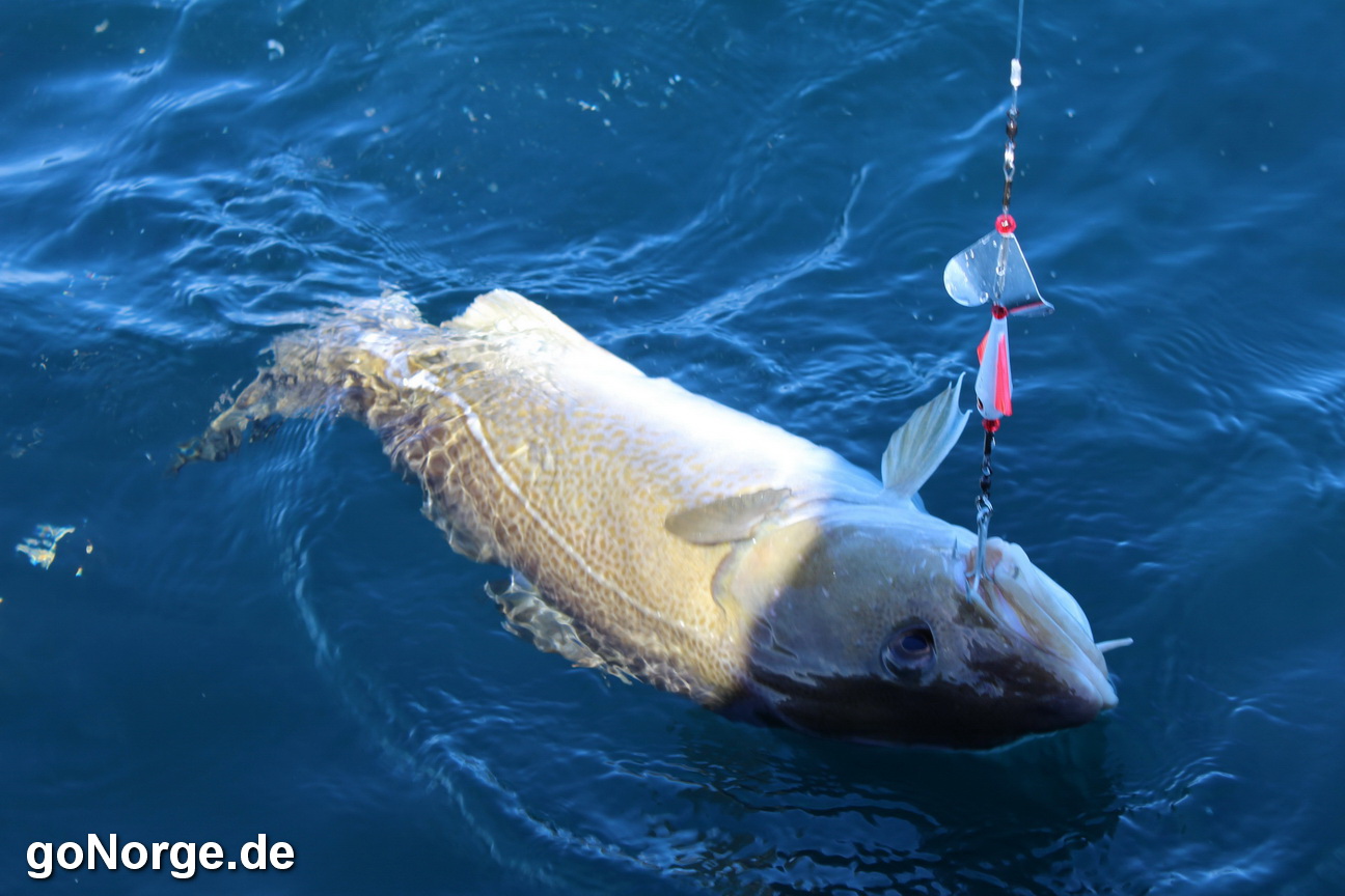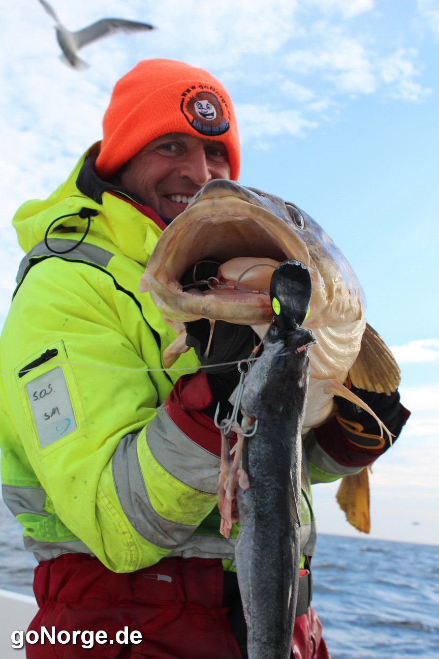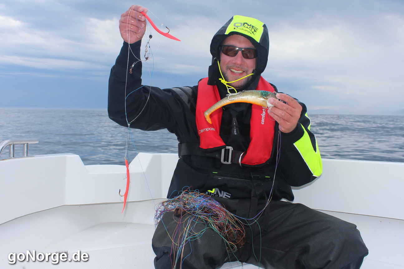 Der von uns entwickelte Köder ist ja seit Kurzem in der endgültigen Version bei Fishing Adventure erhältlich und wurde an diesem Freitag von uns erstmals ausgiebig am Nordkap getestet. Wir sind sehr positiv überrascht worden. Absinkgeschwindigkeit, Aktion und Fängigkeit stimmen- Dorsch, Schellfisch und Seelachs sind ganz wild drauf, in das "Propellertier" zu beißen! Zwei extra angeschaffte Unterwasserkameras - bis 100m wasserdicht - sollten Aufnahmen vom „SK“ machen. Leider erlitten beide Geräte einen Totalschaden durch Wassereinbruch bei ca 40m Tiefe!