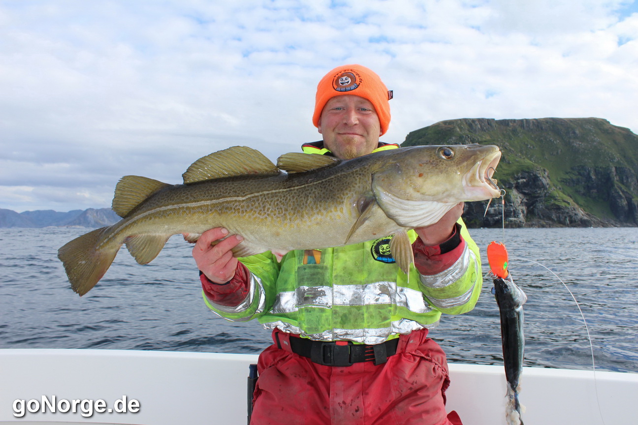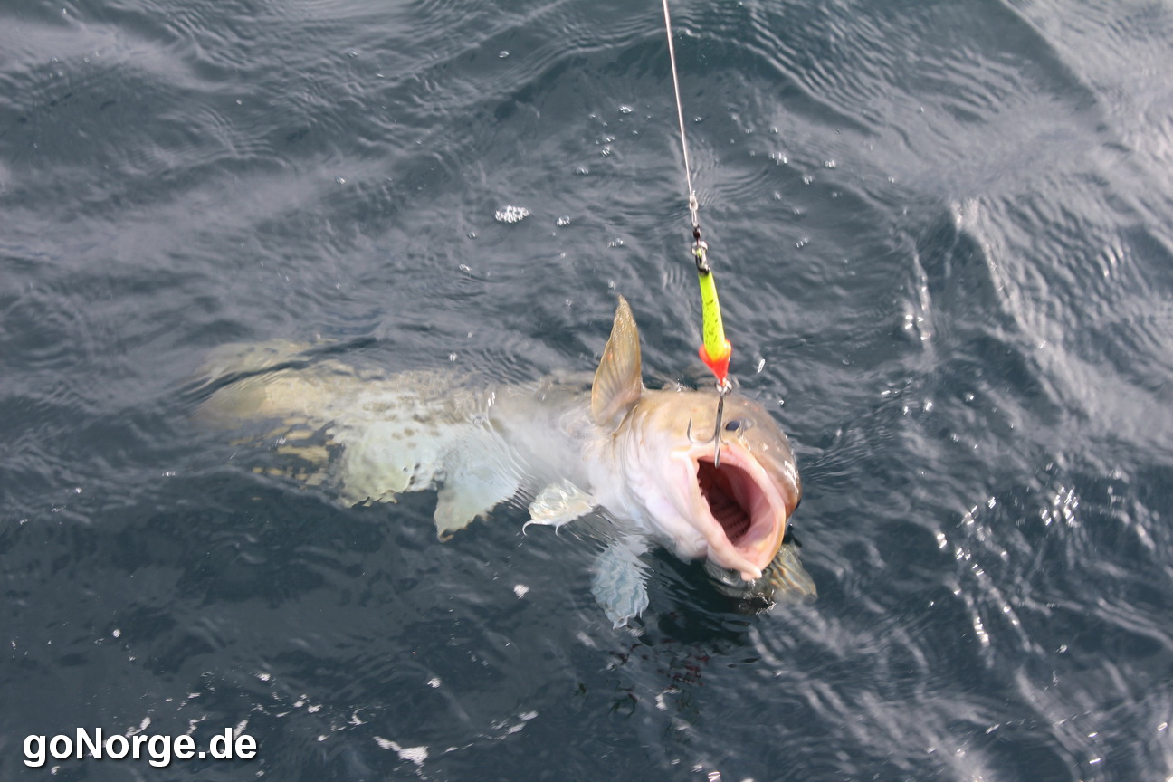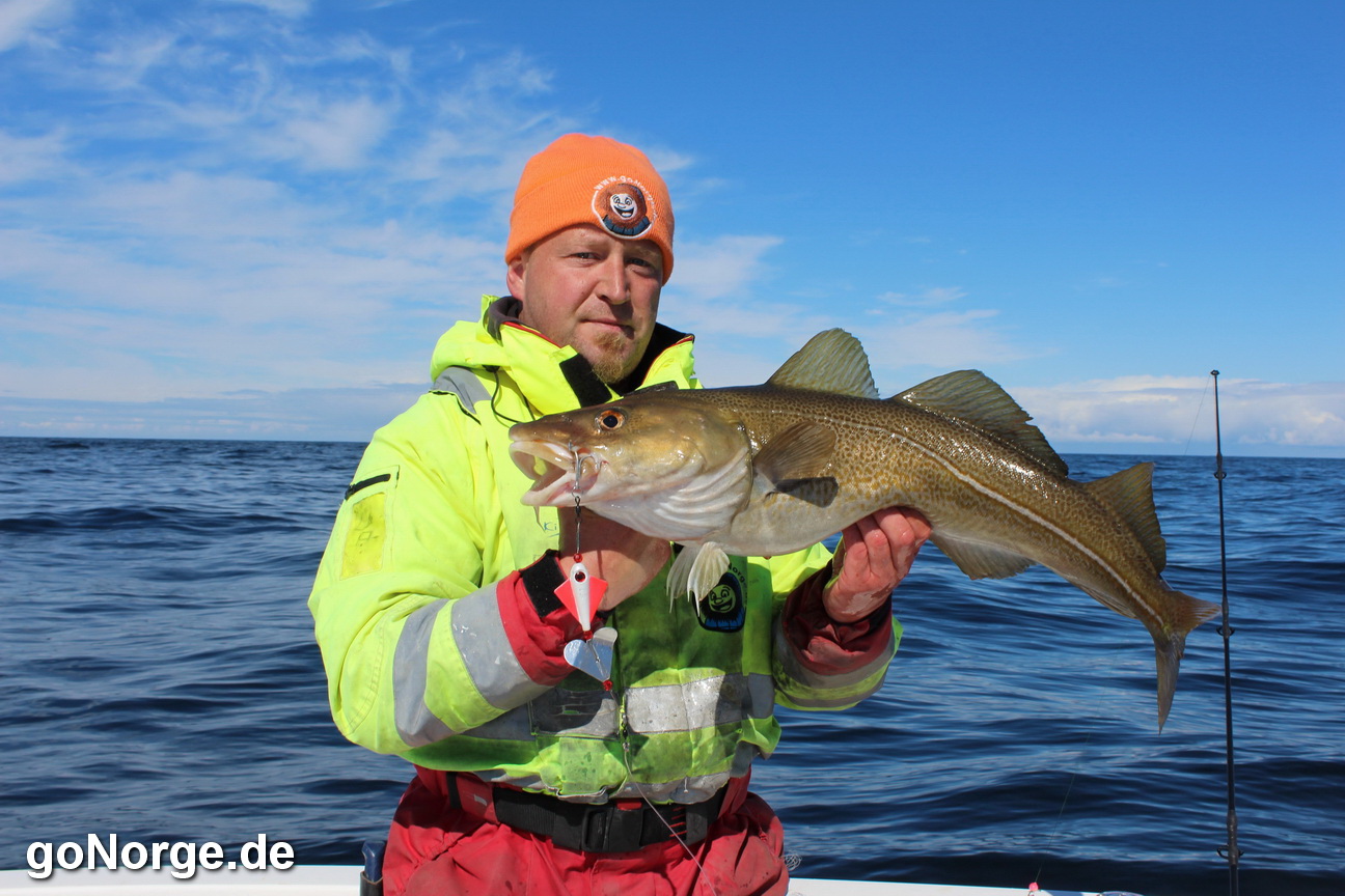Der von uns entwickelte Köder ist ja seit Kurzem in der endgültigen Version bei Fishing Adventure erhältlich und wurde an diesem Freitag von uns erstmals ausgiebig am Nordkap getestet. Wir sind sehr positiv überrascht worden. Absinkgeschwindigkeit, Aktion und Fängigkeit stimmen- Dorsch, Schellfisch und Seelachs sind ganz wild drauf, in das "Propellertier" zu beißen! Zwei extra angeschaffte Unterwasserkameras - bis 100m wasserdicht - sollten Aufnahmen vom „SK“ machen. Leider erlitten beide Geräte einen Totalschaden durch Wassereinbruch bei ca 40m Tiefe!