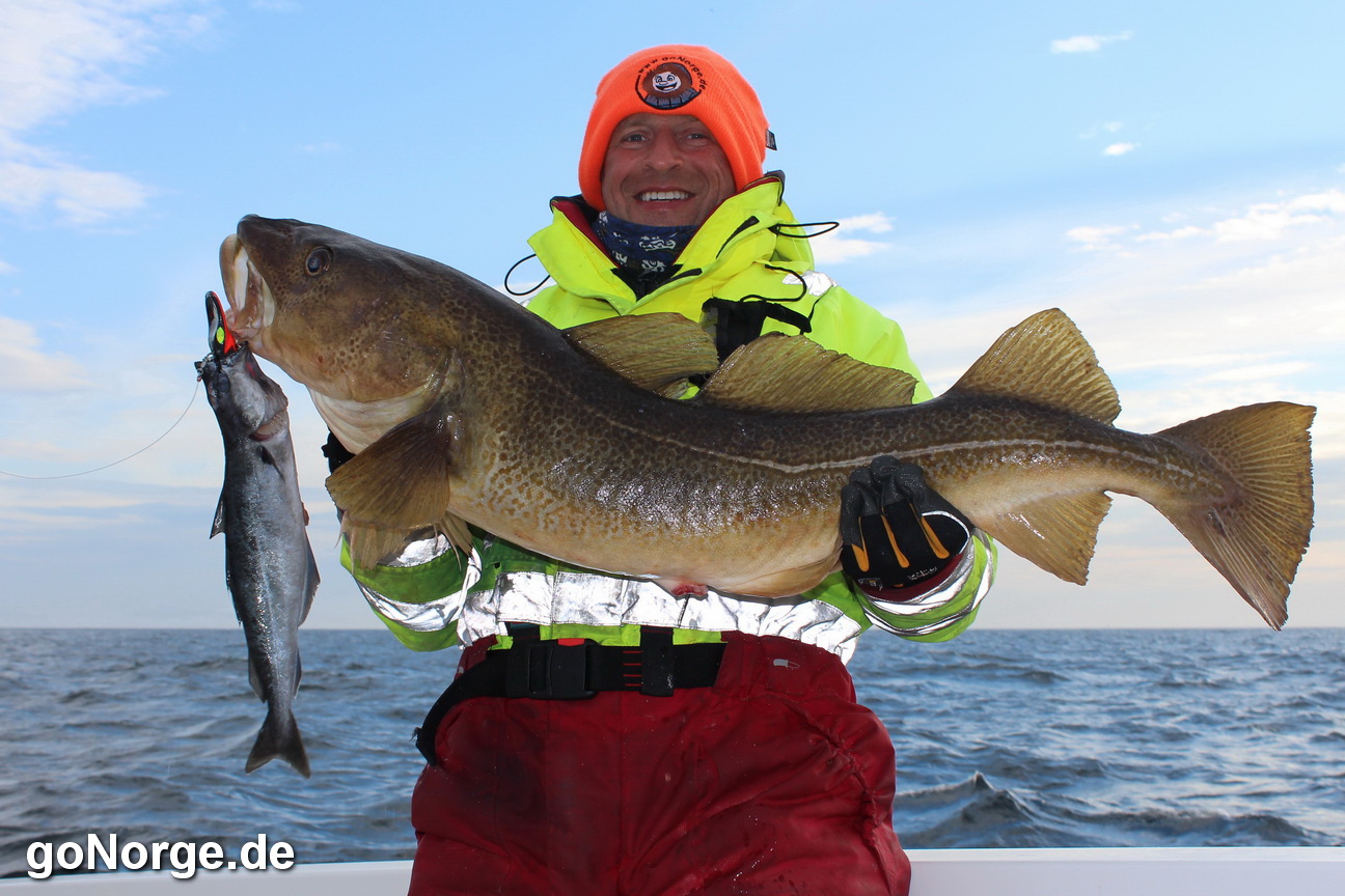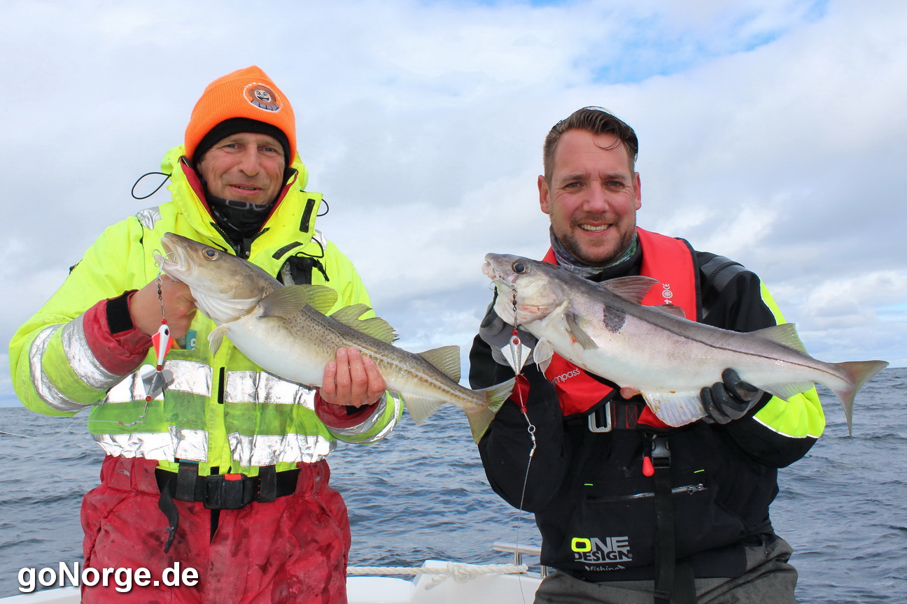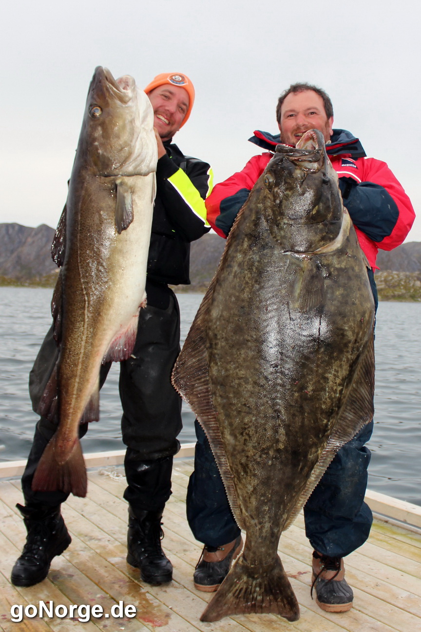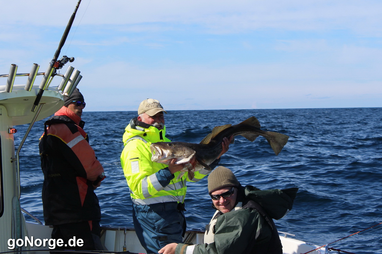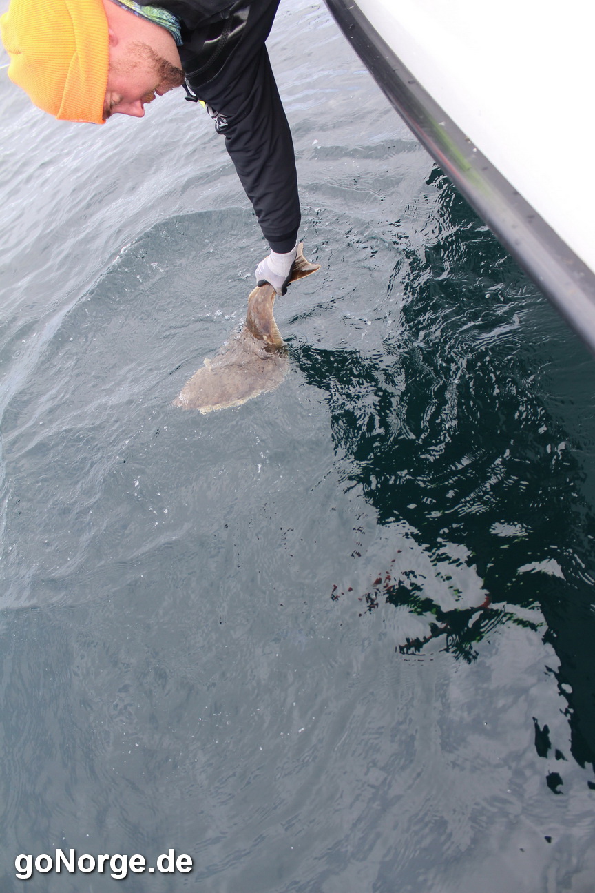 Der Samstag empfing uns mit ungemütlichem Regenwetter, keiner hatte es eilig aufs Wasser zu kommen. Ab 11 Uhr zappelten die ersten guten Dorsche, Schellfische und Steinbeisser an den Ruten. Aber an diesem Tag fing es an - Fluch aber auch Segen... Wale! Schweinswale, Tümmler, Delfine, Zwergwale und mächtige Buckelwale räuberten in unserem Angelrevier. Wenn diese faszinierenden Säugetiere auftauchen gibt es Erinnerungen fürs Leben, aber die Fischwelt wird böse aufgescheucht und vergrämt. Besonders die Heilbutte waren bei Anwesenheit von Walen im Revier nicht zu fangen. In Folge machten eine mittelmäßige Angelei und aufkommender Wind die Entscheidung leicht. Und bei Außentemperaturen im einstelligen Bereich, wie an den meisten Tagen, ab in die warme Bude!