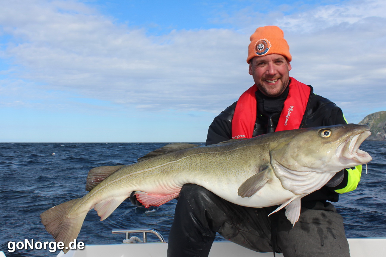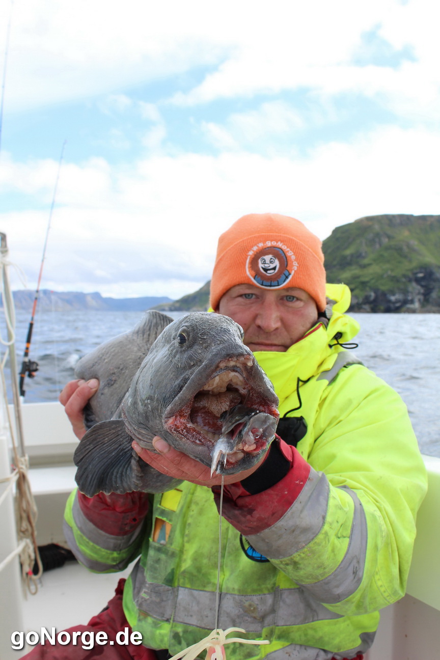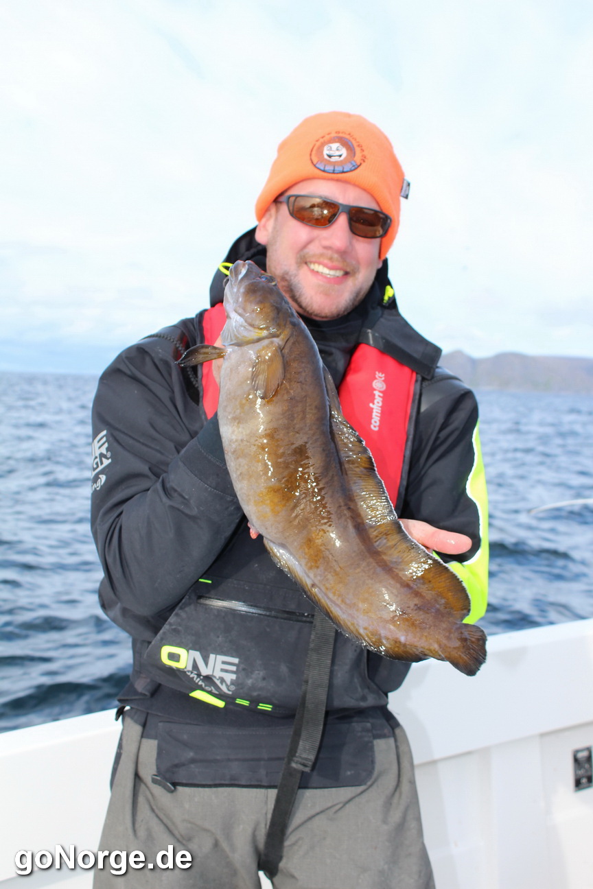 Das Wetter hat sich beruhigt, aber an diesem Morgen war es noch so kabbelig, dass so mancher Teilnehmer etwas Magengrummeln (dezent ausgedrückt) auf dem Boot hatte und nicht alle Besatzungen den Tag durchfischten... Wir fuhren gegen 08.00 Uhr mit 5 Booten und 15 Mann auf die Barentsee hinaus. 4 kleine Heilbutte wurden gefangen und zurückgesetzt, wir hatten einen ca. 30kg Butt, der neugierig an die Oberfläche kam um einen gehakten Dorsch zu begutachten.Weitere 2 Butts gingen bei den Gästen während der Landung verloren. Ausbaufähig! Unser neuer Köder "Seelachskiller" hat bei einem kurzen Test erstmal „nur“ Dorsch gefangen,- das Revier ist nicht so sehr für dicke Köhler bekannt... Aber er funktioniert! Etliche Dorsche bis 15kg, gute Schellfische, Steinbeisser und der übliche Beifang sorgten für einen kurzweiligen Angeltag auf allen Booten. Nach stundenlangem Schaukeln in einer unangenhmen Kreuzsee fanden alle Teilnehmer zeitnah den Weg ins Bett. Erholung tat Not, um am nächsten Tag mit neuer Kraft angreifen zu können!
