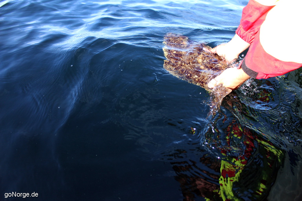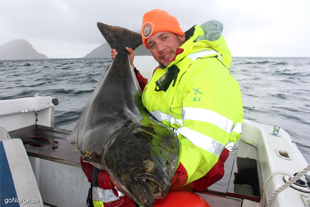 Vor dem Stappan (Vogelfelsen) lief dann tatsächlich ein guter Strom und wir bewegten uns mit bis zu 3 km/h. Die Bedingungen stimmten schon mal. Nach kurzer Zeit war dann Thomas Rute gut gebogen und die Maxel goNorge Edition gab willig Schnur frei. Nach ein paar schönen Fluchten die einen größeren Fisch vermuten ließen, konnte Robert einen schönen 109cm langen und 17kg schweren Plattfisch ins Boot heben. Endlich der erste vernünftige Fisch im Boot. Köder natürlich Kveite Killer mit einem stattlichen Seelachs. Aus dem Video wurde nichts, kleiner Bedienungsfehler durch Bastian…