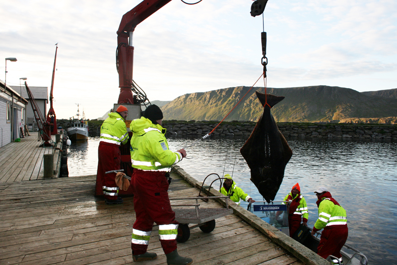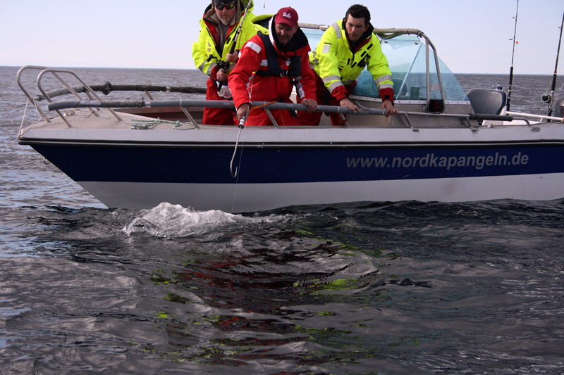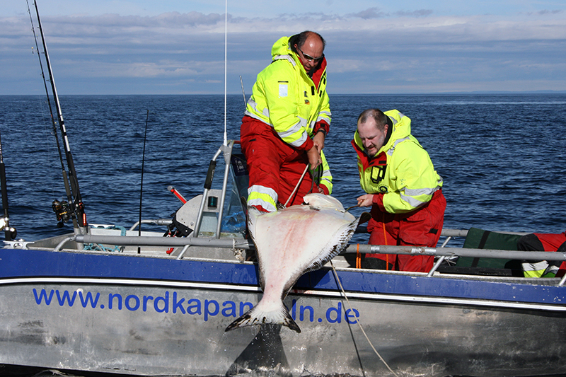 Die erste gemeinsame Ausfahrt an Tag Zwei, mit erklärtem Zielfisch Heilbutt, führte uns an die Strömungskante zum offenen Meer. Bei sehr guten und warmen Wetter zeigte sich die Barentsee von ihrer besten Seite, trotzdem herrschte eine optimal kräftige Strömung. Nach kurzer Zeit konnte Jens einen ca. 10 Kilo schweren Heilbutt mit ganzem Köderfisch am Kveite Killer System verführen. Etwa nach 2 Stunden später biss es dann bei unserem Gast Fabian, der den ersten Heilbutt seiner Anglerkarriere landen konnte. Und gleich ein Exemplar von 45 Kilo, welches nach Spannendem Drill sicher harpuniert werden konnte. Kaum hatte die Crew den Fisch an Bord, bog sich bereits die Rute von unserem Gast Jens, der ebenfalls seinen ersten Heilbutt von 38 Kilo auf die Planken legen konnte. Nach etwa 2 Stunden relativer Beissflaute klingelte das Teamhandy mit dem Hilfsgesuch von unserem Gast Holger, der sich im Drill mit einem großen Heilbutt befand. Der zweite Heilbutt seines Angellebens erwies sich als 84 Kilo schwerer und 190 cm lange Plattfisch der Spitzenklasse, der gleichzeitig der neue Camprekord hier in Skarsvag ist. Das goNorge Team konnte den glücklichen Fängern bei den erfolgreichen Landungen beistehen und vor allem von jedem Drill etliche Fotos und umfangreiches Videomaterial erstellen.