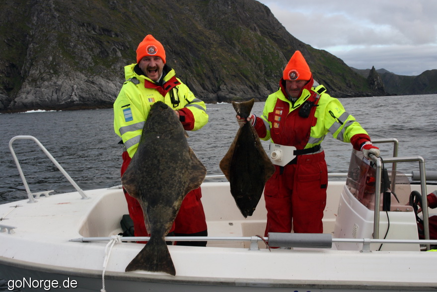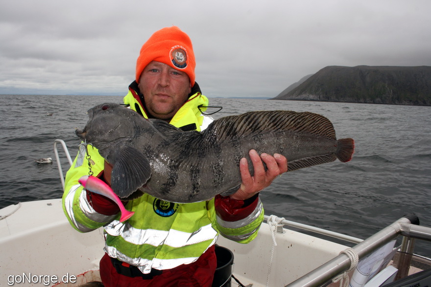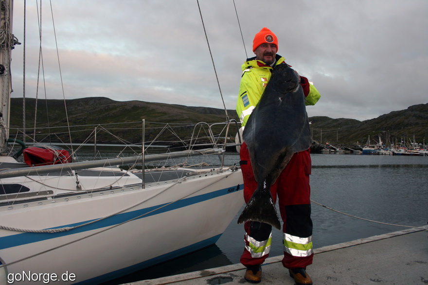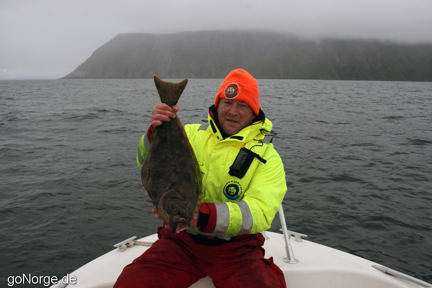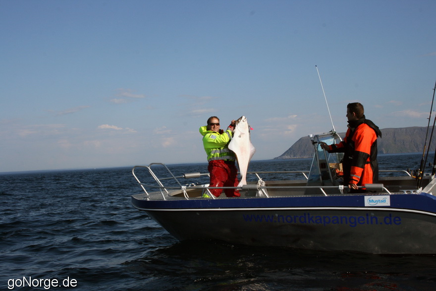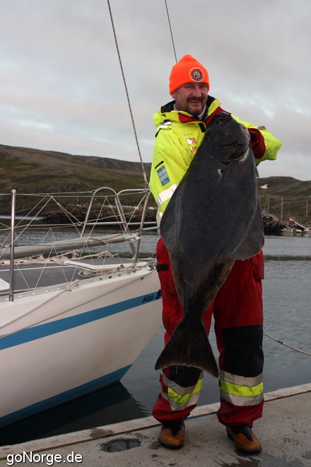 Dienstag ging es Jens gar nicht gut und unser Vermieter fuhr ihn netterweise nach Honnigsvag zum Arzt. Dieser päppelte Jens soweit wieder auf, dass wir mittags in See stechen konnten. Der Seegang und die günstige Wettervorhersage erlaubten es uns heute, direkt vor das geographische Nordkap zu fahren. Lumbs und Steinbeisser gab es dort reichlich, doch das Ziel war ein Anderes. Bei kräftiger Strömung hatten wir bisher unsere besten Erfolge auf Heilbutt, doch genau diese zog heute so gar nicht. Jens verlor einen Heilbutt im Drill. Thomas rettete die Serie (seit dem 1.Angeltag des Urlaubes im Mai pro Ausfahrt mindestens 1 Heilbutt vom goNorge Team) dann doch noch. Ein XXL Royber Jig Gummifisch reizte einen 16 Kilo Heilbutt zum Anbiss. Nach einer kräftigen Flucht gelang die Landung recht zügig. Einige nette Dorsche sorgten für gelegentliche Abwechslung.