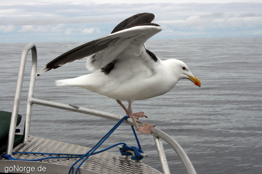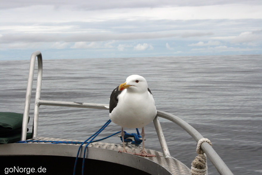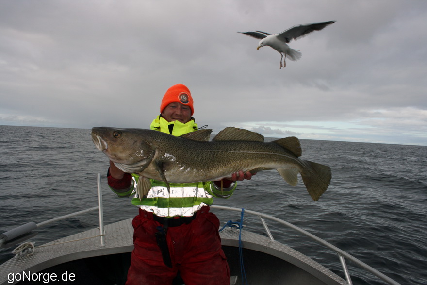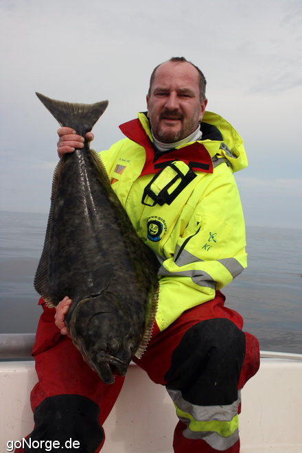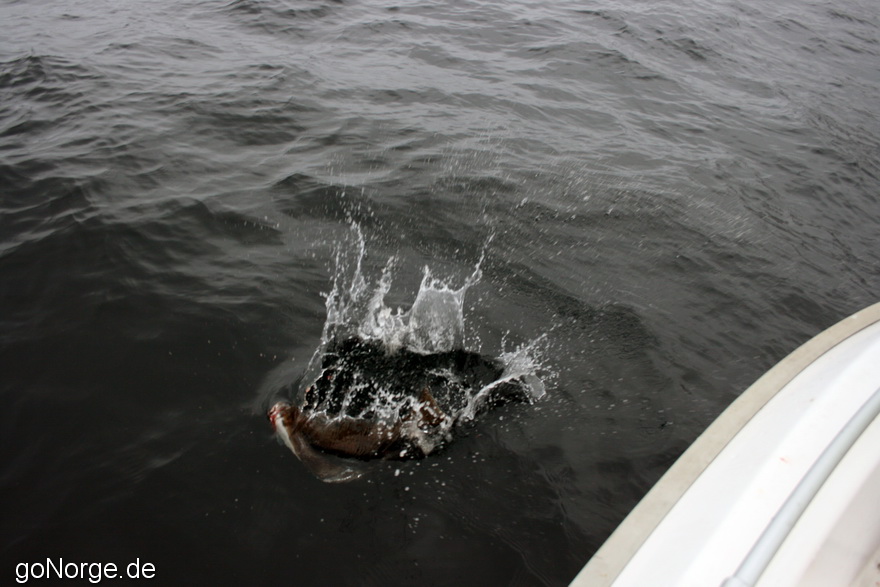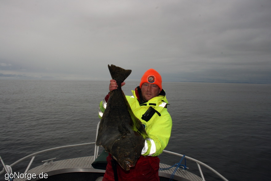 Samstag flaute der Sturm dann ab und gegen Mittag war es wieder gefahrlos möglich, auf das Meer hinaus zu fahren. Gestern war Vollmond und endlich herrschte wieder eine nennenswerte Strömung. Nach zwei Sturmtagen waren die Möwen ausgehungert, weil sie an den Fischkuttern keinen Abfall erbeuten konnten. Ungewöhnlich frech landeten einige Exemplare in und auf unseren Booten und inspizierten die Fischkisten. Die Fische waren auch in Beißlaune. Dorsche bis 17kg und Schellfisch in Massen. Ein stattlicher Heilbutt ging im Drill verloren. Später stach dann der tote Seelachs am KveiteKiller System zwei Mal. Ein knapp maßiger Heilbutt bekam seine Freiheit wieder. Dann durfte die Bremse an der Multi von Jens zeigen, was sie kann. Nach einigen Minuten spannendem Drill testete Robert dann die neue, verbesserte goNorge Harpune. Unser Vermieter hatte morgens den Wunsch nach frischem Heilbutt geäußert. Er durfte sich über diesen Butt von 130cm und 23 kg freuen.