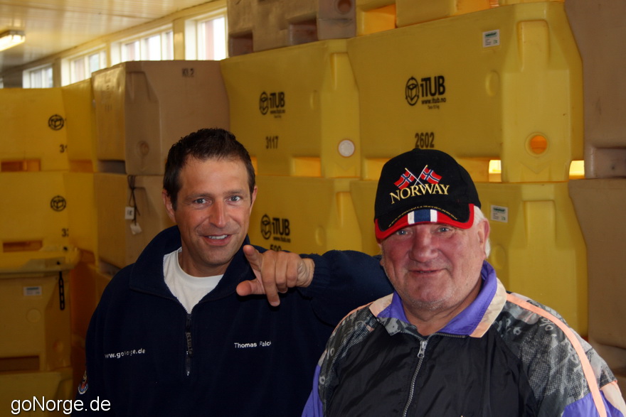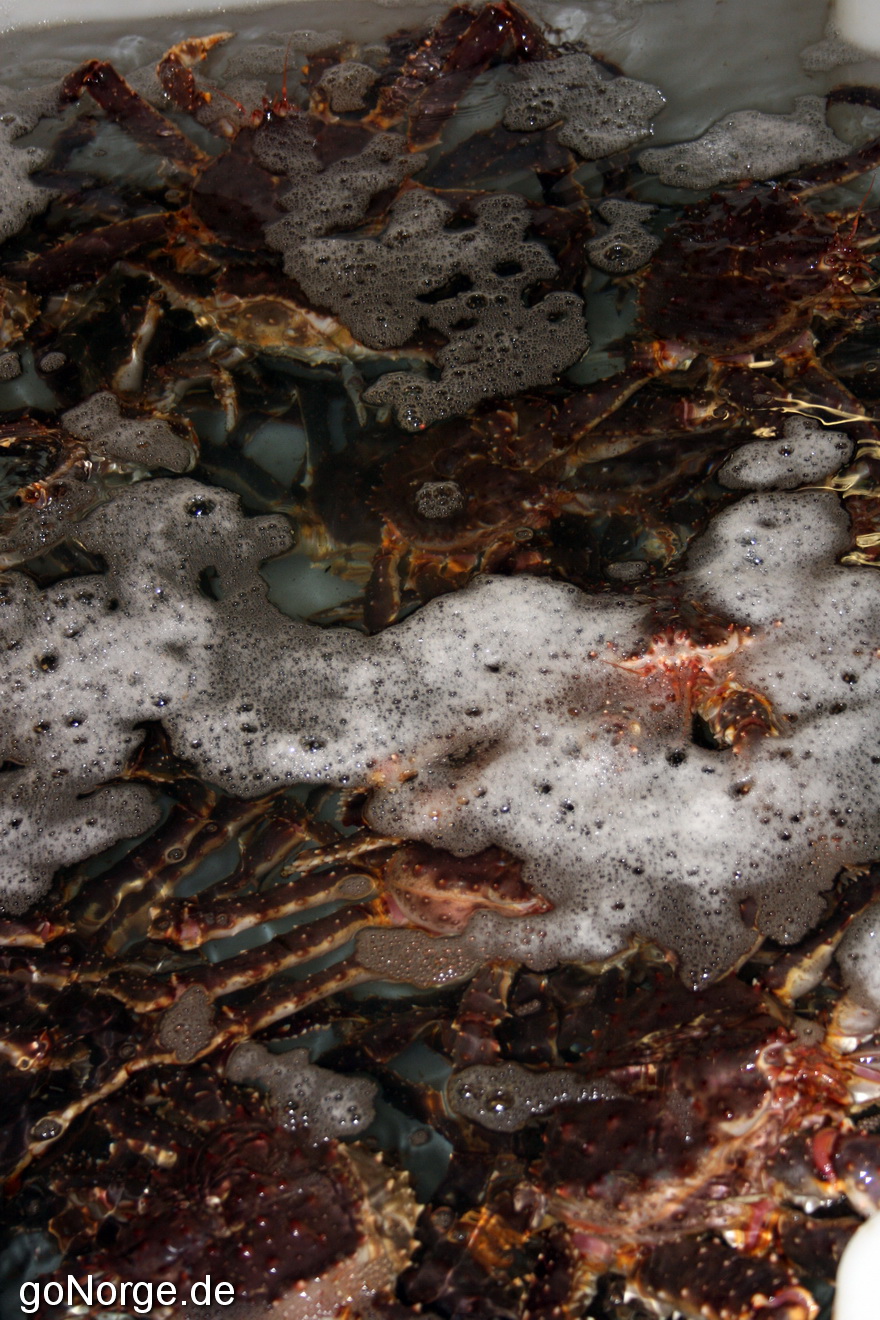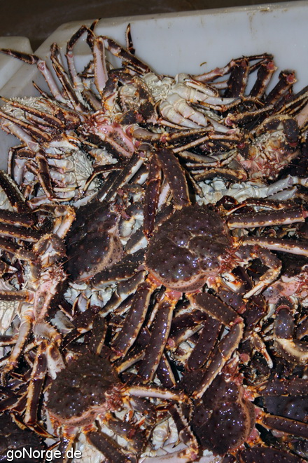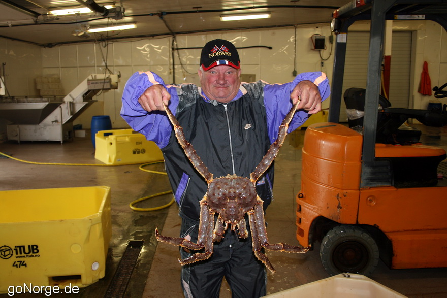Der Montag bot scheinbar gutes Angelwetter,- Windstille und kühlere Temperaturen. Wenn da nicht Seenebel mit Sichtweiten unter 10 Meter gewesen wäre… Wir nutzten die Zeit und unser Vermieter Leif zeigte uns die örtliche Fischfabrik von innen. Hier wurden gerade Königskrabben vom Schiff in Wassercontainer verpackt und für den LKW Transport vorbereitet. Drei dieser martialischen Burschen durften wir uns für´s Mittagessen aussuchen. Robert zerlegte die Krabben nach kurzer Einweisung in ihre leckeren Einzelteile.