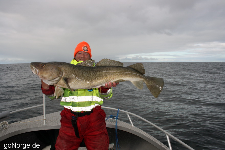 Der Nebel verzog sich gegen Mittag immer mehr und wir bereiteten die dritte Ausfahrt vor. Plötzlich war der Nebel weg und der Wind frischte merklich auf. So wurde beschlossen, nicht zu weit vom Hafen entfernt ein paar leckere Küchendorsche für die Filetkiste zu fangen. Bergmannpilker und kleine Royber Jigs verführten Dorsch um Dorsch. Viele rote Tangdorsche waren darunter und die Metermarke knackten wir auch mehrmals. Dann gab Jens Heilbutt Alarm. Nach hartem Drill tauchte weit in der Abdrift ein 10Kilo Dorsch auf, der sauber im Schwanz gehakt war. Kurze Zeit später passierte es dann tatsächlich und Robert fing einen 6 Kilo Plattfisch auf 175g Bergmann. Der immer stärker werdende Wind drehte von Süd auf West und eine unangenehme Kreuzsee baute sich auf. Ein 5 Kilo Steinbeisser auf Köderfisch am Kveite-Killer war der letzte Streich für heute. Starker Regen setzte ein, wir machten die Boote im Hafen fest und versorgten die Fische. Danach verputzten wir die letzten Königskrabben – Beine und hatten einen netten Abend.
