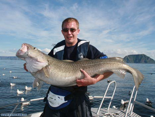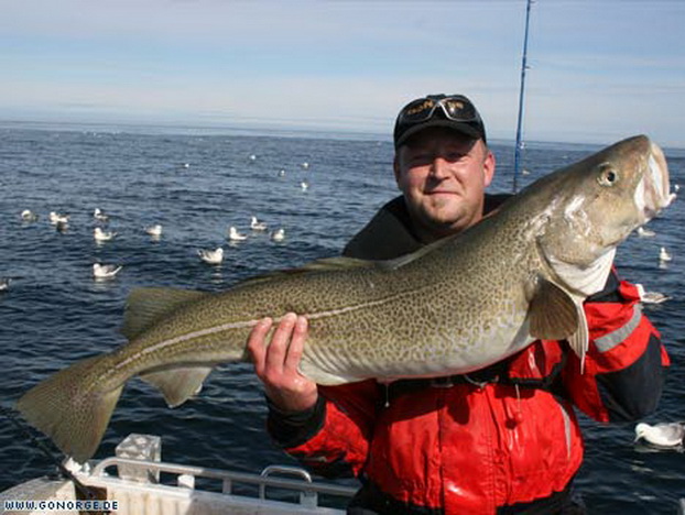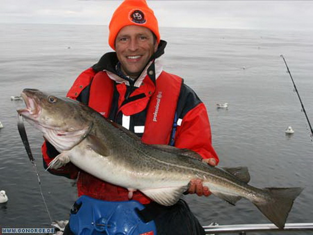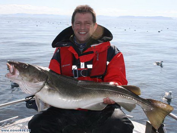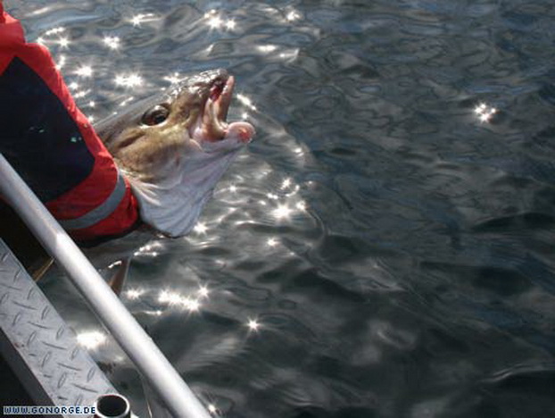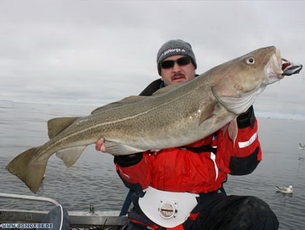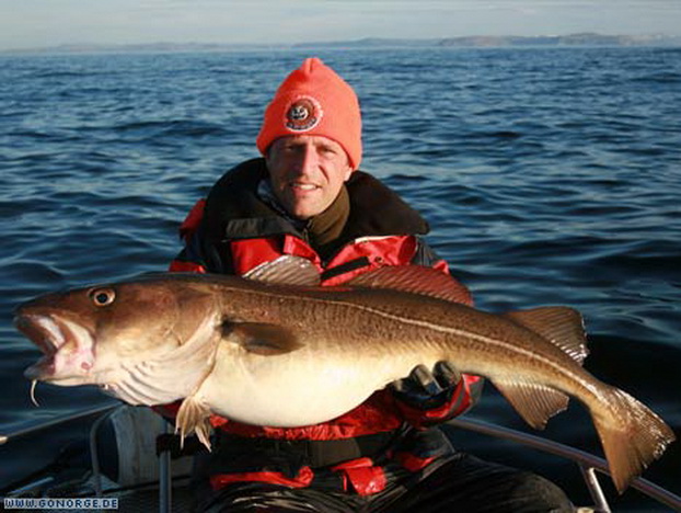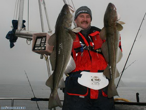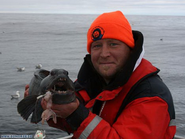 So langsam machte sich Ratlosigkeit breit. Was sollte man tun bei der nächsten Ausfahrt? Wir entschlossen uns es mit ganzen Köderfischen auf Heilbutt zu versuchen, aber schon der Versuch Köderfische an die Angel zu bekommen wurde wieder mit guten Dorschen „bestraft“! Nach einigem Bemühen gelang es uns schließlich ein paar Köderfische zu fangen und wir machten uns guter Dinge die Suche nach „dem„ Heilbutt. Doch egal was wir auch versuchten, es war einfach unmöglich am Dorsch „vorbei zu Angeln“. Wieder und wieder griffen sich große Dorsche bis 16 Kilo unsere Köderfische und brachten uns an der Rand der Verzweiflung. Da die Dorsche im Mittelwasser jagten war es fast egal, in welcher Tiefe wir den Köder anboten. Nebenbei gesellte sich wieder der ein oder andere Steinbeisser dazu, wenn man den Köder grundnah anbot. So ging auch dieser Tag ohne Heilbuttkontakt zu Ende und so langsam wuchs die Erkenntnis, dass dies „leider“ eines der besten Dorschreviere Norwegens ist.