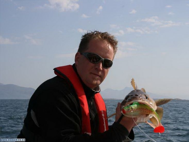 Gegen Nachmittag klarte das Wetter dann etwas auf und wir machten uns wieder auf den Weg zu unserem Heilbutt - Hotspot. Heute sollten wir für unsere Mühe und Ausdauer endlich belohnt werden. Holger konnte einen Heilbutt von 50 Pfund landen und krönte den Tag mit dem bis dahin größten Fisch des Urlaubs, seinem größten Fisch bisher.Wieder im Hafen angekommen wurde Holger mit unserer obligatorischen goNorge-Krone zum Tageskönig gekrönt, eine Krönungszeremonie, die er bestimmt nie vergessen wird.