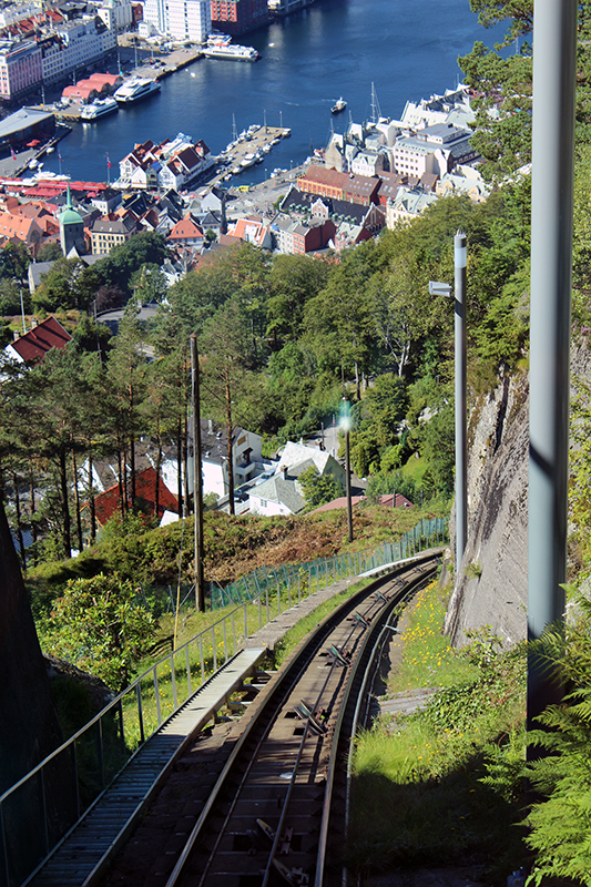 Bergen Standseilbahn Fløibanen: Auf eine Wegstrecke von 848 Metern geht es hoch zum Fløyen Aussichtspunkt. Die Fahrt dauert ca. 5-8 Minuten und ist für Groß und Klein ein tolles Erlebnis.