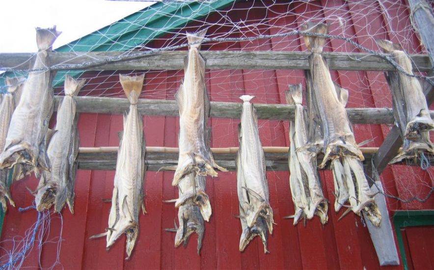 In einer Kneipe in Deutschland findet man öfter einen Becher Salzstangen oder Ähnliches auf dem Tresen,- in Norwegen dagegen liegt schon mal ein harter und trockener Stockfisch vor den Gästen und jeder reißt oder schneidet sich ein paar Stücke als Snack ab. Auch sonst wird nebenbei gerne mal am Stockfisch geknabbert.